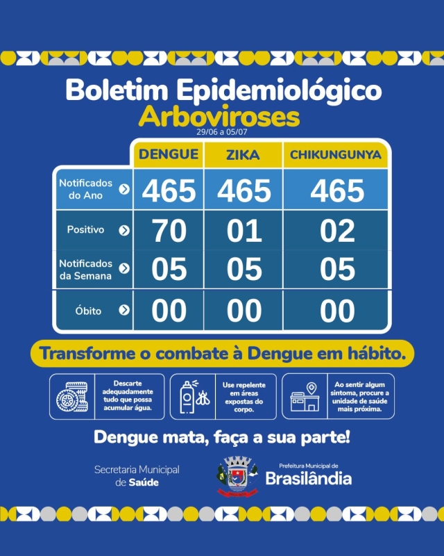 A Secretaria Municipal de Saúde de Brasilândia divulgou nesta semana o boletim epidemiológico atualizado sobre arboviroses no município. Os dados revelam que,