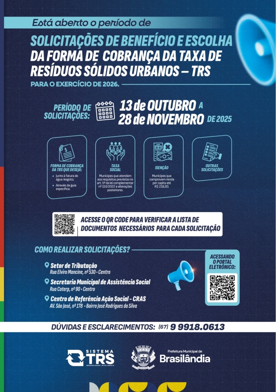 Está aberto o período para que os contribuintes de Brasilândia definam como desejam pagar a Taxa de Resíduos Sólidos Urbanos (TRS) – popularmente conhecida como Taxa de Lixo – no ano de 2026. De 13 de outubro a 28 de novembro, a população pode escolher a forma de cobrança e solicitar benefícios que vão desde descontos até a isenção total, dependendo da situação econômica de cada família.