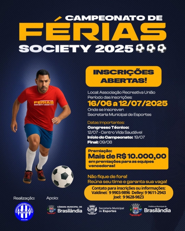 A Prefeitura de Brasilândia, por meio da Secretaria Municipal de Esportes, abre as inscrições para o Campeonato de Férias Society 2025, que promete