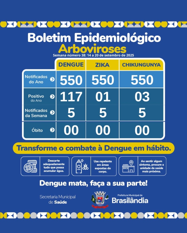 A Secretaria Municipal de Saúde divulgou o Boletim Epidemiológico de Arboviroses referente à semana número 38, de 14 a 20 de setembro de 2025. Até o momento, o município contabiliza 550 notificações de Dengue, com 117 casos positivos confirmados neste ano. Ainda segundo o levantamento, não houve registro de óbito pela doença.