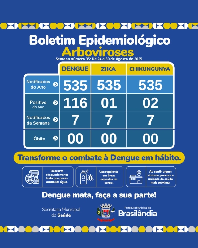 A Secretaria Municipal de Saúde de Brasilândia divulgou nesta semana o Boletim Epidemiológico de Arboviroses referente à semana 35, compreendida entre os dias 24 e 30 de agosto de 2025. De acordo com os dados, o município totaliza, desde o início do ano, 535 notificações de casos suspeitos de dengue, zika e chikungunya.