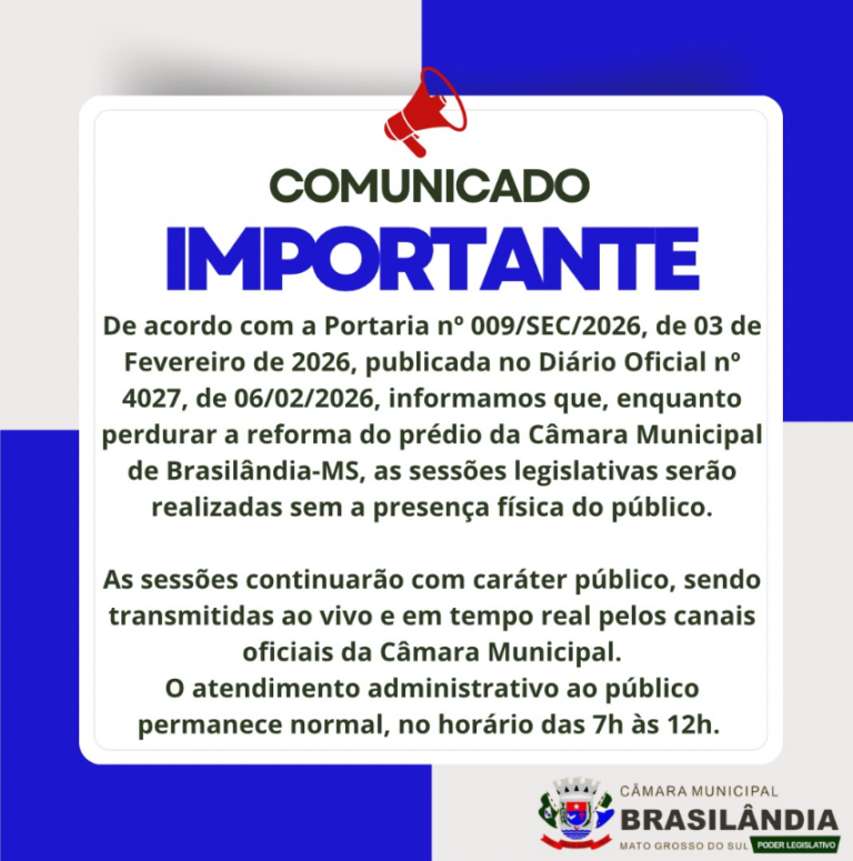 BRASILÂNDIA (MS) – A Mesa Diretora da Câmara Municipal de Brasilândia anunciou, por meio de um comunicado oficial, que as sessões legislativas