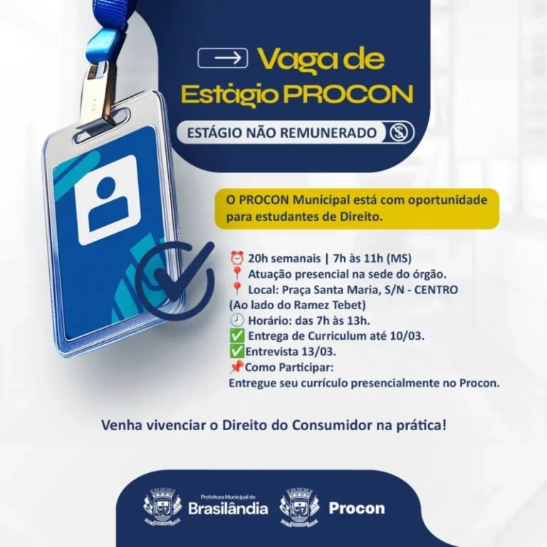A experiência prática é um diferencial na formação acadêmica. Pensando nisso, o Procon Municipal de Brasilândia está com uma vaga de estágio não remunerado aberta para