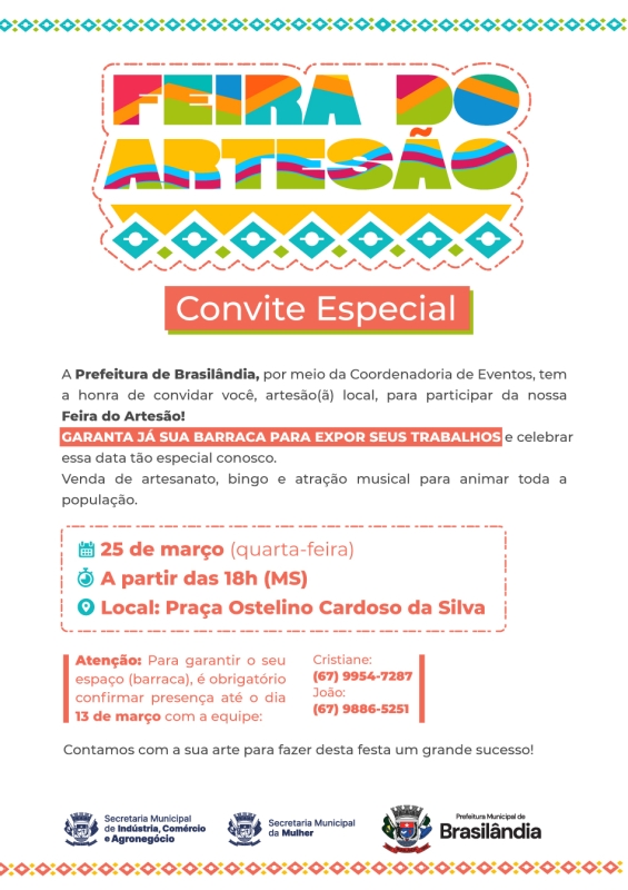 Brasilândia recebe amanhã (25/03), a partir das 18h (horário de MS), a Feira do Artesão, na Praça Ostelino Cardoso da Silva. O evento,