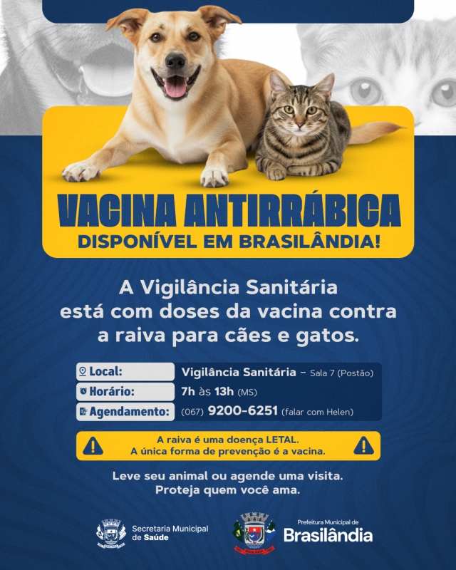 A saúde dos animais de estimação também é uma questão de saúde pública. Em Brasilândia, a Vigilância Sanitária informa que doses da vacina contra a