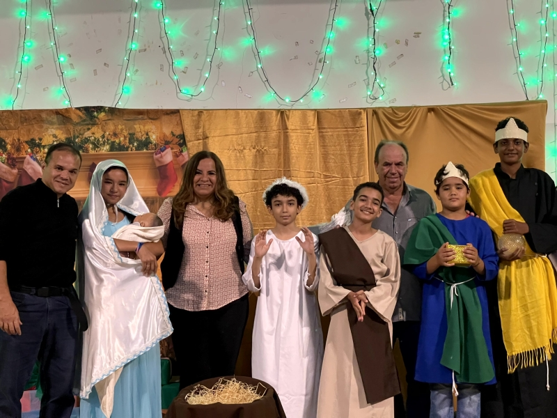 A Igreja Católica apresentou uma encenação tocante do nascimento de Jesus, com Maria, José, anjos e pastores junto à manjedoura, em uma iluminação suave e dourada. O momento ganhou um toque especial com a entrada de crianças formando um círculo em volta do palco. O balé da professora Eliane Francé, com a música “We Wish You a Merry Christmas”, e a potente voz do cantor Anderson, da Igreja Caminho do Céu, com “Oh Happy Day”, animaram ainda mais a festa.