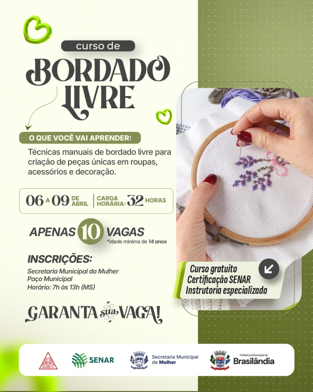 Fonte: https://www.brasilandia.ms.gov.br/portal/noticias/0/3/6385/secretaria-da-mulher-abre-inscricoes-para-curso-de-bordado-livre-com-10-vagas-em-brasilandia